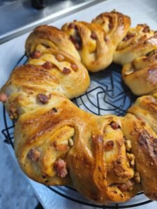 Un Pan-brioche salato a forma di ciambella, una vera celebrazione di profumi e sapori perfetto per impreziosire la tavola di Pasqua con eleganza e gusto. Soffice e dorato all’esterno, sprigiona già al primo sguardo tutta la sua invitante fragranza, mentre la forma a corona lo rende scenografico e simbolico, ideale per questa occasione speciale.