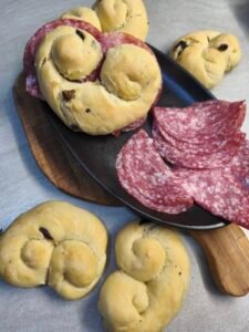 Per renderli ancora più gustosi ho aggiunto olive taggiasche direttamente nell’impasto, che donano un tocco aromatico irresistibile. Una volta pronti, li ho farciti con salame tipo Milano: un abbinamento semplice ma sempre vincente, che ha conquistato tutti!